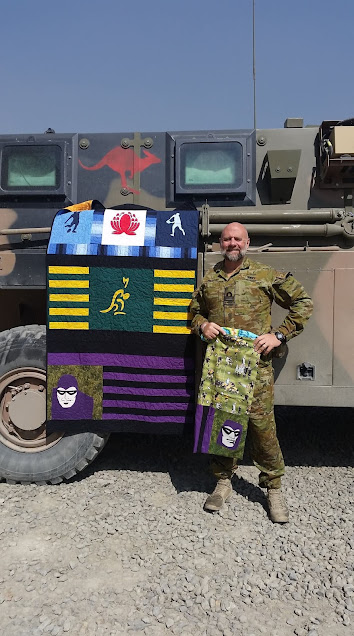 My quilt and laundry bag was a surprise, my wife organised both without me knowing about it. I’d been away for about half way though my seven month deployment to Afghanistan and it was a great pick-me-up when I was suffering the mid-deployment blues. Wallabies, Waratahs & The Phantom; my wife knows me only too well. The wonderful lady who made my Lb & quilt had traveled through Afghanistan in the 70’s, so it was a nice connection that we shared, albeit in far different circumstances.