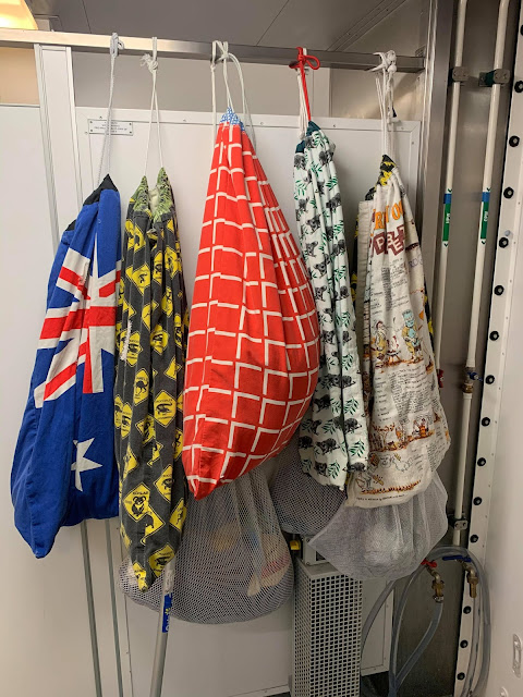 I am fortunate to have two laundry bags, one which is used for while at sea, very bright and beautiful and very easy to see amongst all the other laundry bags that AHQ had given us on HMAS Canberra. It certainly stands out amongst all the grey. It always puts a smile on my face, when doing such mundane jobs as laundry.
