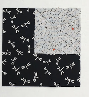 Place a white square on one of the four black squares, with right sides together, and pin in the corner so that the second diagonal line (the shorter one) is closest to the outside corner