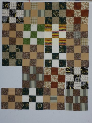 And these are what we have left. We decided that this just needs a few more to be big enough, again without sashing I think. my sister in law just emailed me to say that she has put ten nine patches in the mail today so they are going to fill this out nicely. They are blue and cream apparently so I think the blue and the brown will go together nicely! Can’t wait to see them!