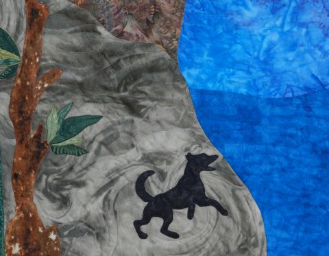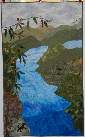 Now this quilt had to be made from scratch. I really wanted to do it myself (as I do with a lot of requests) but just knew I did not have time to do it justice so I turned to Liz B. As soon as I told Liz the story she had a picture in her mind and she agreed to take it on. I arranged for Michele from Geelong (I know Michele, not Melbourne) to embroider the verse of the song on the the blue fabric and that was sent up to Liz B. Liz set to work creating the picture in her mind; a branch of a gum tree hanging over the river with a black dog on the shore. Perfect!