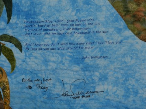 I don’t have a conduit to many celebrities, star or persons of note, but I am blessed that one of my friends, Gordon, is actually well known to John Williamson. He had already told John about Aussie Heroes and so I asked him if he thought John would be amenable to signing the quilt in question. Gordon had no doubt that John would be happy to help out so he approached him and before long I had my answer, a resounding “yes”.