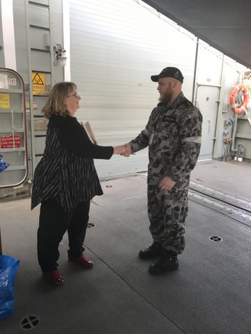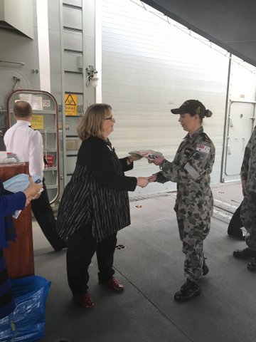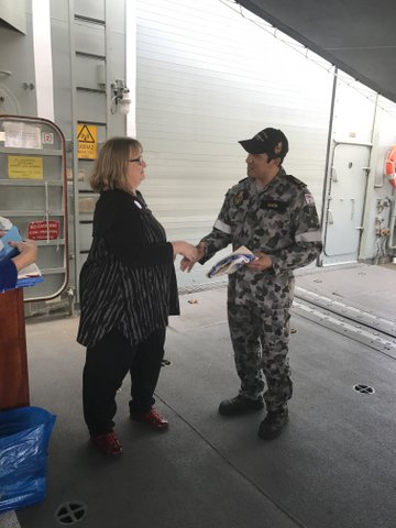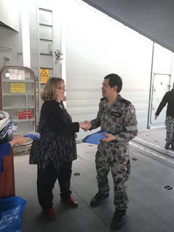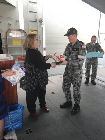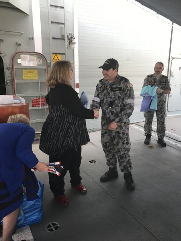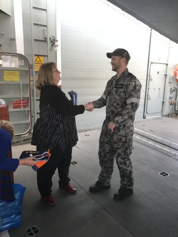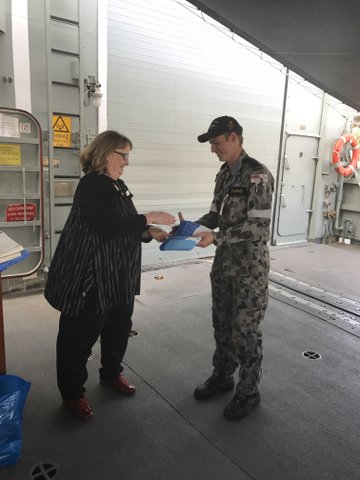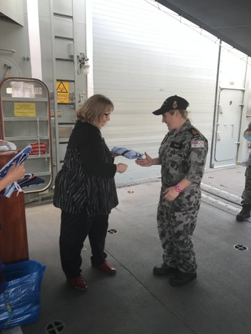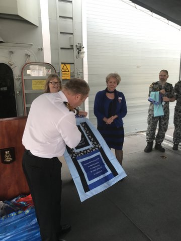 Twice we have supported the crew of HMAS Darwin whilst they have deployed as part of Operation Manitou. The first time we did so I was there on the wharf when HMAS Darwin came home and was presented with a wonderful framed and signed photograph of Darwin and her crew festooned in the quilts they had received. After the first deployment the then Captain, Commander Terry Morrison, invited my Sydney-based quilters to come for a tour of the ship which they greatly enjoyed and then he attended our annual dinner. He also invited me to attend the HMAS Darwin ball which was a great pleasure.