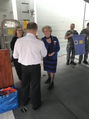 Next it was the turn of the Commanding Officer, Commander Phill Henry. As a kiwi he is a proud All Blacks fan so his laundry bag, made and presented by Bev U, incorporated some silver fern fabric.