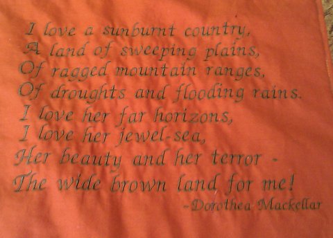 Here is another special quilt that I just had to give it’s own space and story. The very clever Michelle love words and text.. Way back in August she applied to the Dorothy Mckellar Estate for permission to reproduce the iconic My Country poem on a quilt. She wasn’t sure that they would reply but in very short order they did. After a few emails going to and fro to narrow down the details Michelle was finally granted permission , with certain conditions, to use the poem as she had requested. In fact part of what they said is