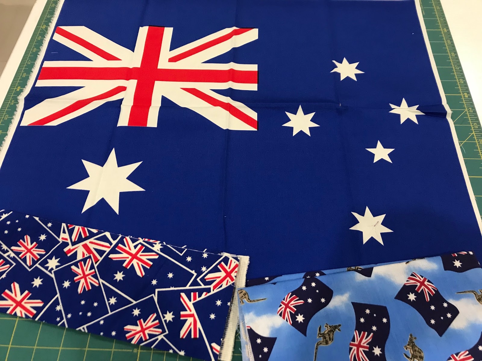 You can buy flag panels that are around pillow case size at Spotlight. You can also buy the great all over flag fabric below on the left from Spotlight. The other flag fabric, by Nutex, is usually available at Patchwork stores. I am hoping it is still available.