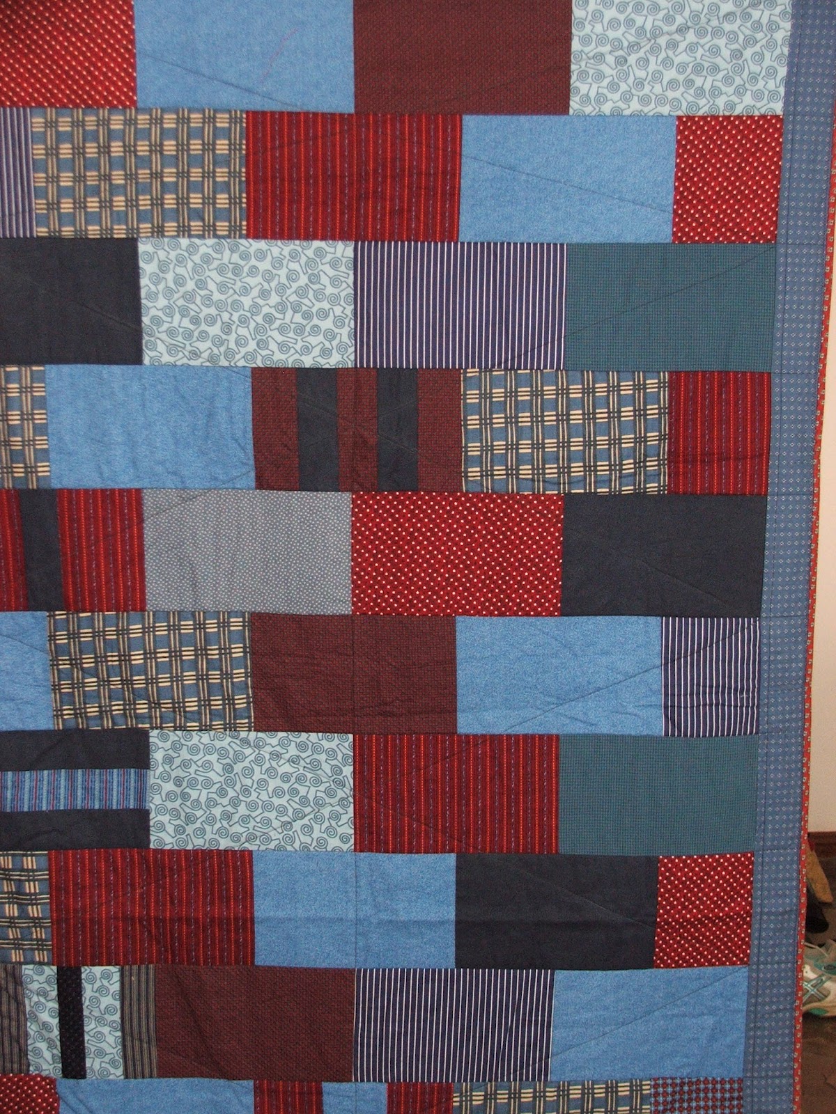 While that was happening I manned the cutting table. The biggest pieces were cut into quilt backings, then laundry bags. Old sheets and some really (and I mean REALLY) ugly fabric was cut into laundry bag linings. Scraps were cut ito 6 1/2″ strips, then squares and then smaller squares or binding lengths.