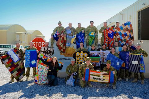 ANZAC Theme, Poppies, AUS flag, NZ Flag and Iraq flag. Would like his personal details on his quilt and bag. I can have the details embroidered.