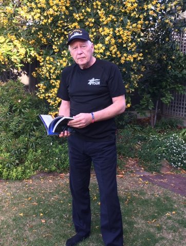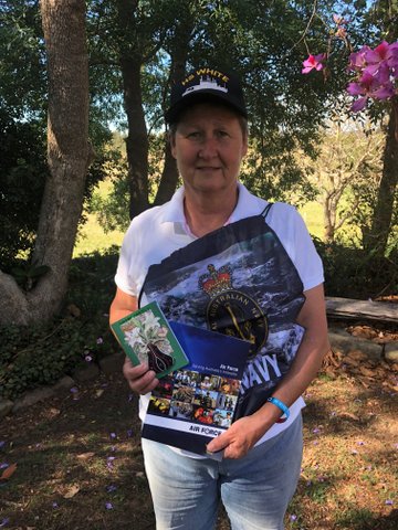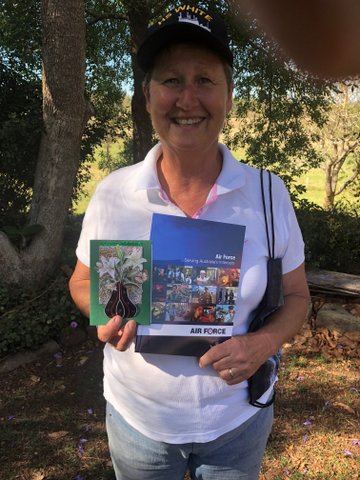 Husbands are often our enablers, here is Grant, Pennie’s husband with a couple of books, courtesy of the RAAF, a cap and T shirt from Pennie’s bag of gifts