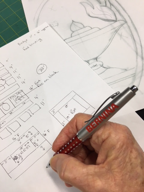 I just LOVE all my treasures from the bag. Nic Nac’s from the Services touch my heart. And my table cloth from Dubai…gorgeous! Using Bernina pen to design quilt LOL!