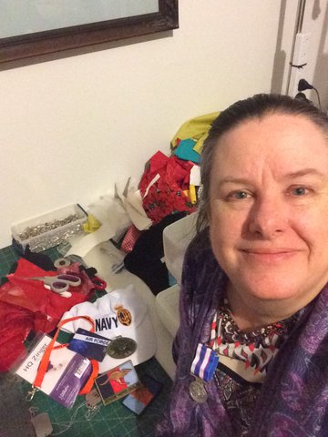 Kate with some of her gifts, including one of three HMAS Newcastle supporter medals.