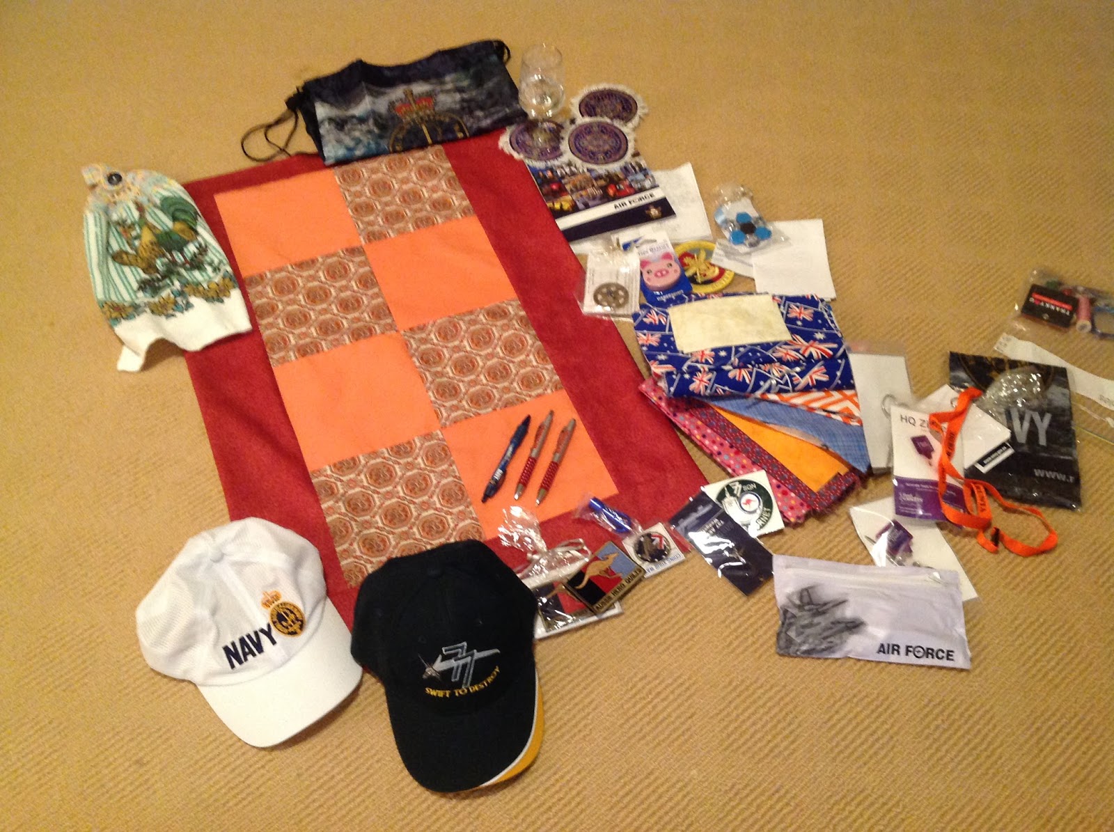 As if just being able to attend and meet recipients wasn’t exciting enough, Jan-Maree decided to give each quilter attending the dinner a Gift Bag as an extra thank you. She contacted all the Squadrons, ships and Army units that we have provided for, plus a few others, and asked them to send whatever items they could. These came in to AHQ headquarters in various boxes and packages over a period of time, were sorted and, if necessary, some smaller items were packed in cellophane bags.