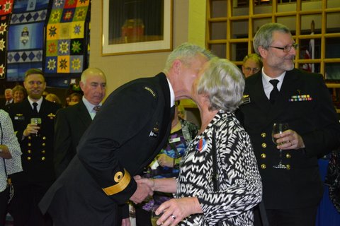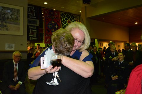 Hugs and kisses a plenty when recipients met, in this case the Commodore greeting Gail who worked on his quilt with me.