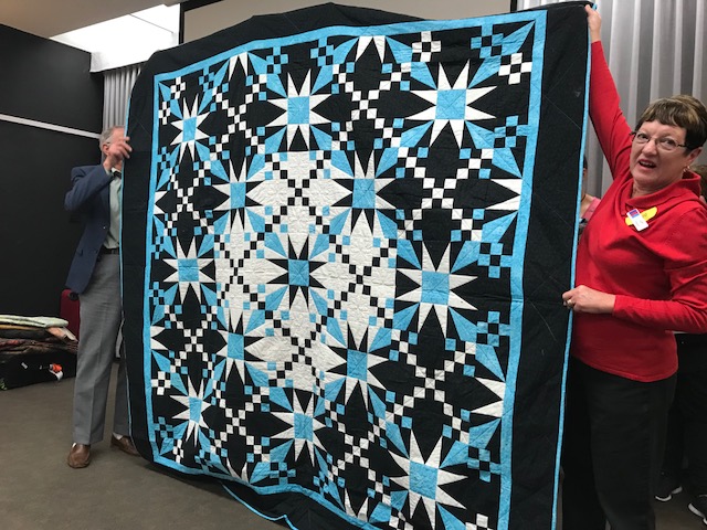 Fiona’s husband popped in to say hello. I am not sure if I have told you before but he is one of our recipients, actually one of mine, as I made him his laundry bag (Lynn made his quilt). I asked him if he would stay around and say a few words to the assembled about what it meant to him and his men to receive their quilts. He is a wonderful humble man and when he speaks about AHQ he speaks from the heart. I know quite a few ladies were moved by his words. I am so glad he was able to stay.