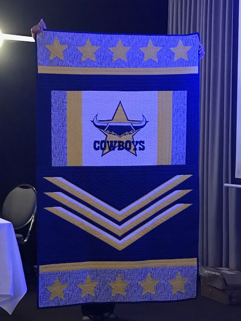 Next along came our very own Quilting Chief Petty Officer Cath. Cath has deployed since our last dinner and she was able to tell a few stories. She told the story of one on her recipients who was deployed to Kabul but left before she got there. She mentioned to some people in location that she had made his laundry bag but had not heard from him. They told her that when he got it he wore it over his uniform for two days as a cape!! OK I guess that means he liked it! 😀 That will do me!
