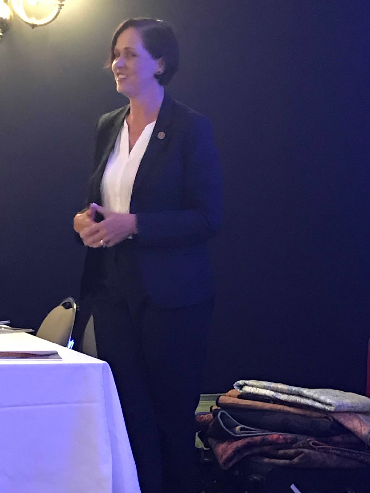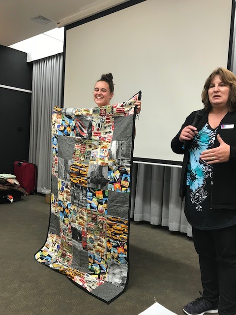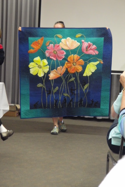 Next along came our very own Quilting Chief Petty Officer Cath. Cath has deployed since our last dinner and she was able to tell a few stories. She told the story of one on her recipients who was deployed to Kabul but left before she got there. She mentioned to some people in location that she had made his laundry bag but had not heard from him. They told her that when he got it he wore it over his uniform for two days as a cape!! OK I guess that means he liked it! 😀 That will do me!