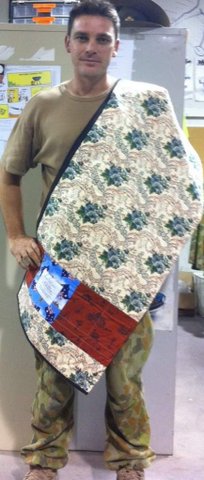 Thanks a lot for efforts to make and send a quilt over. It has helped me sleep as the commercially made doona are too bloody hot and I like to sleep cooler which the quilt allows. A better night’s sleep means a lot over here; keeps me and my mates safer when we’re out and about.