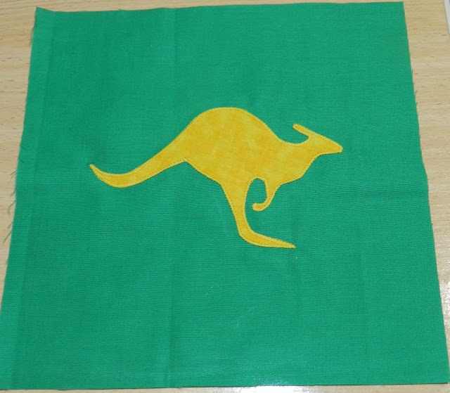Quite simply cut a background piece 9 inches square in either Green or Gold – please stick to some shade of these colours. Then choose your Aussie design to add and applique away. Feel free to sign your block if you wish. Either a subtle signature somewhere on the block or with a message. I chose to do a roo and a map of Australia. You can do whatever you like….. there are lots of Aussie animals or even Aussie words. You can use a small close zigzag or you can use button hole stitch. You can even do it by hand if you are so inclined.