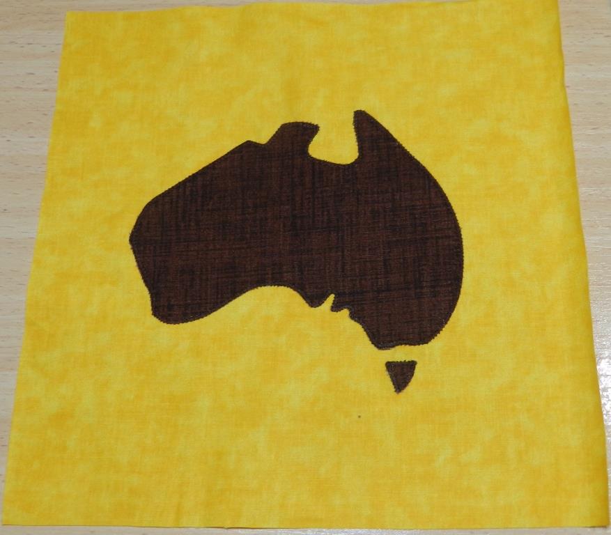 Quite simply cut a background piece 9 inches square in either Green or Gold – please stick to some shade of these colours. Then choose your Aussie design to add and applique away. Feel free to sign your block if you wish. Either a subtle signature somewhere on the block or with a message. I chose to do a roo and a map of Australia. You can do whatever you like….. there are lots of Aussie animals or even Aussie words. You can use a small close zigzag or you can use button hole stitch. You can even do it by hand if you are so inclined.