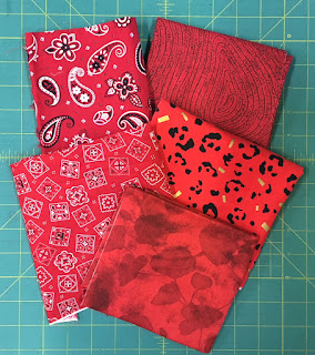 Cut three 4 x 4 inch squares of fabric that is BLACK background with a white and/or red print