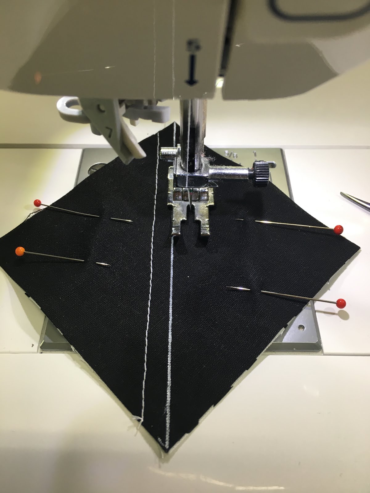Pin together, a white square and black square with right sides together.  Stitch on both sides of the line 1/4 inch from the line.