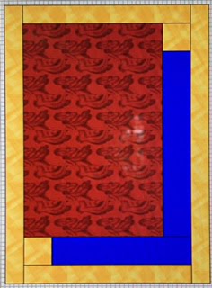 Join the long royal blue and yellow strip to the side of the red rectangle as shown and press seam allowances to the red fabric