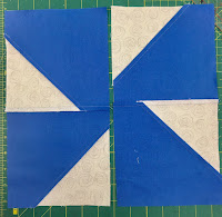 Place a white square on a blue square with right sides together and fitting snugly to one corner with the diagonal line positioned as in the picture. Pin both sides of the line and then sew along the line.