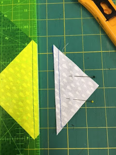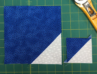 Remove pins and place ruler over the block as shown, and cut away the corner leaving a 1/4 inch seam allowance.  Sew a seam, as shown, on the off cut triangles.
