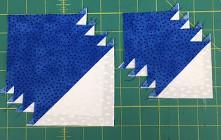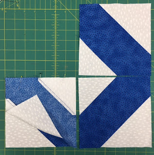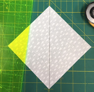 Fold two of squares as shown and sew a seam where the two small triangles come together, making half the block