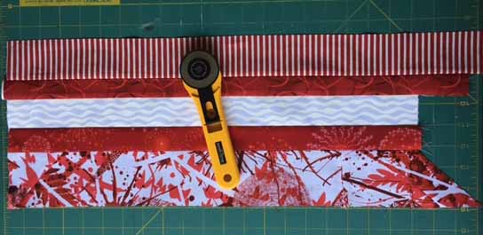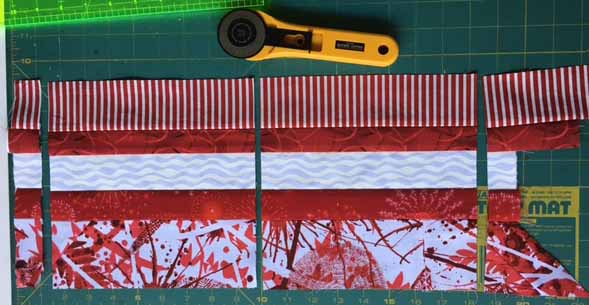 Cut strips about 20 inches long and 3 inch wide, 1 3/4 inch wide, 2 inch wide, 1 1/2 inch wide and 2 1/4 inch wide.