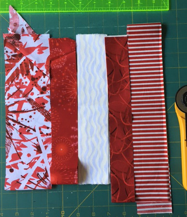 The background stripes can be any type of print e.g. large prints or small prints, stripes or spots or any combinations of red and white. Choose 5 fabrics that contrast well with each other.