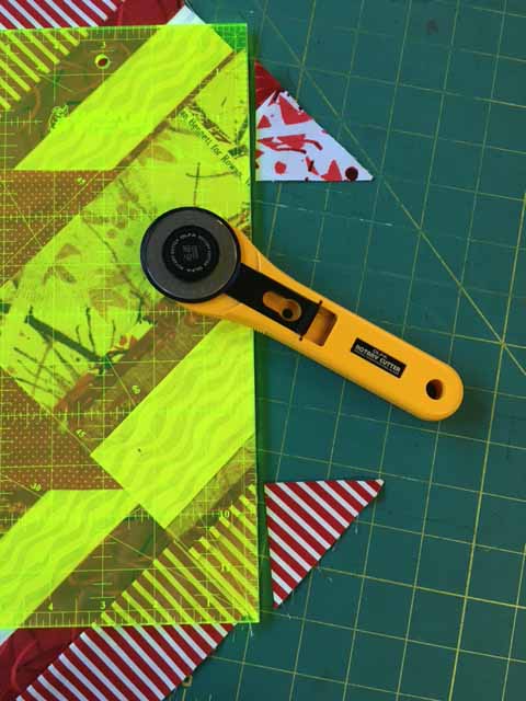Position the piece of fabric made from strips on cutting mat and trim off a small piece as shown on the right and then cut two 8 1/2 inch squares.