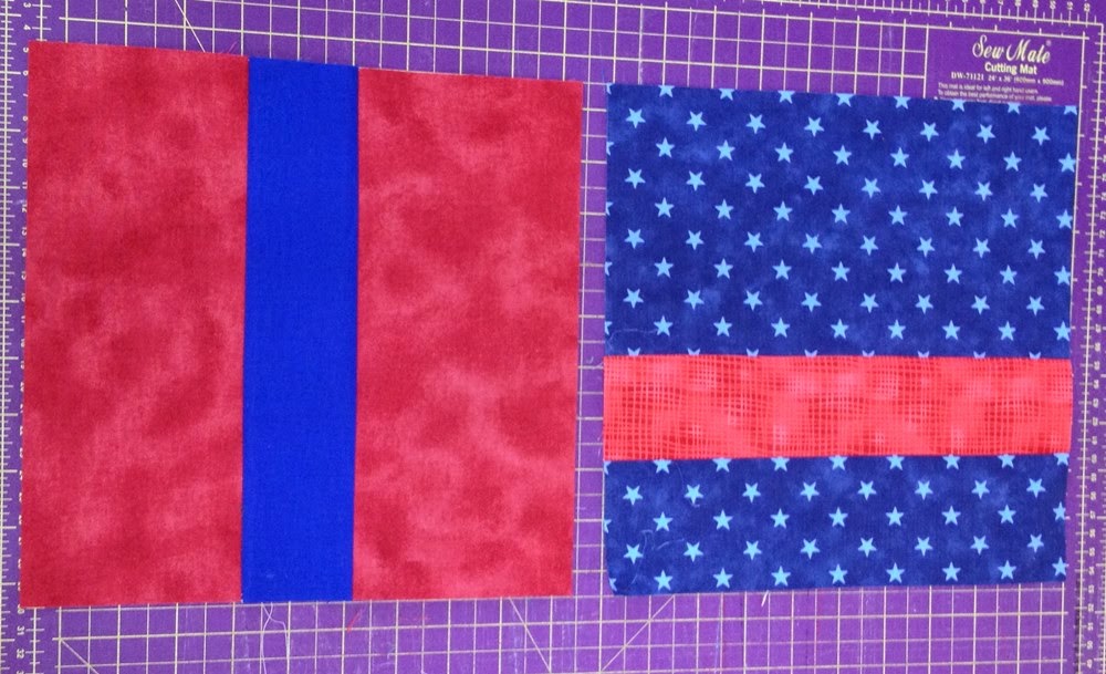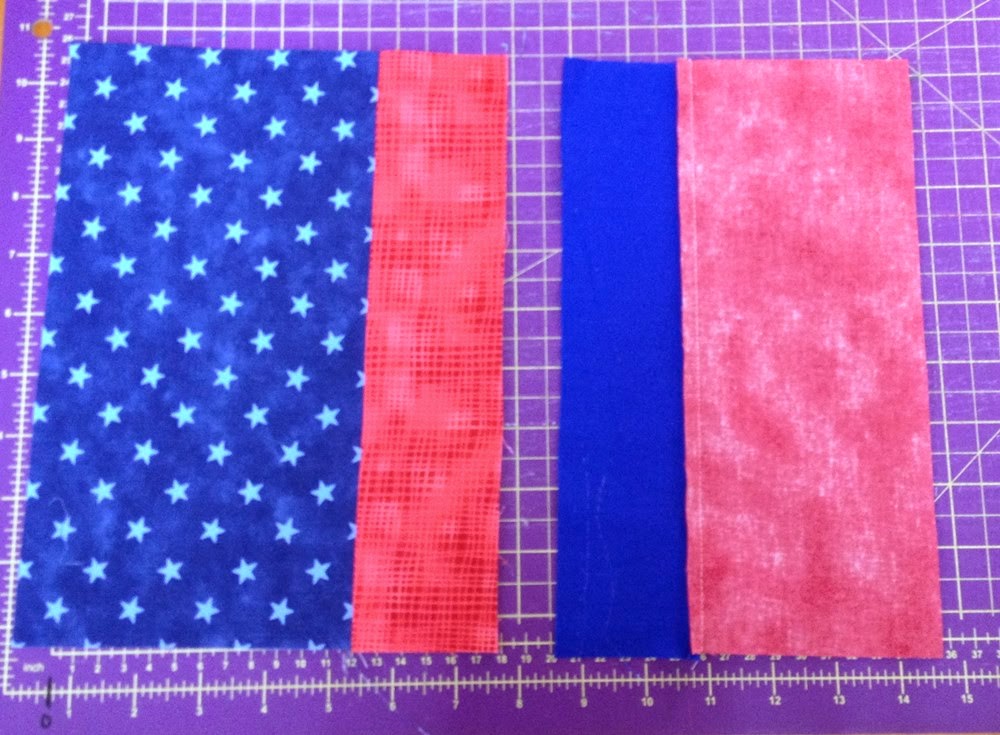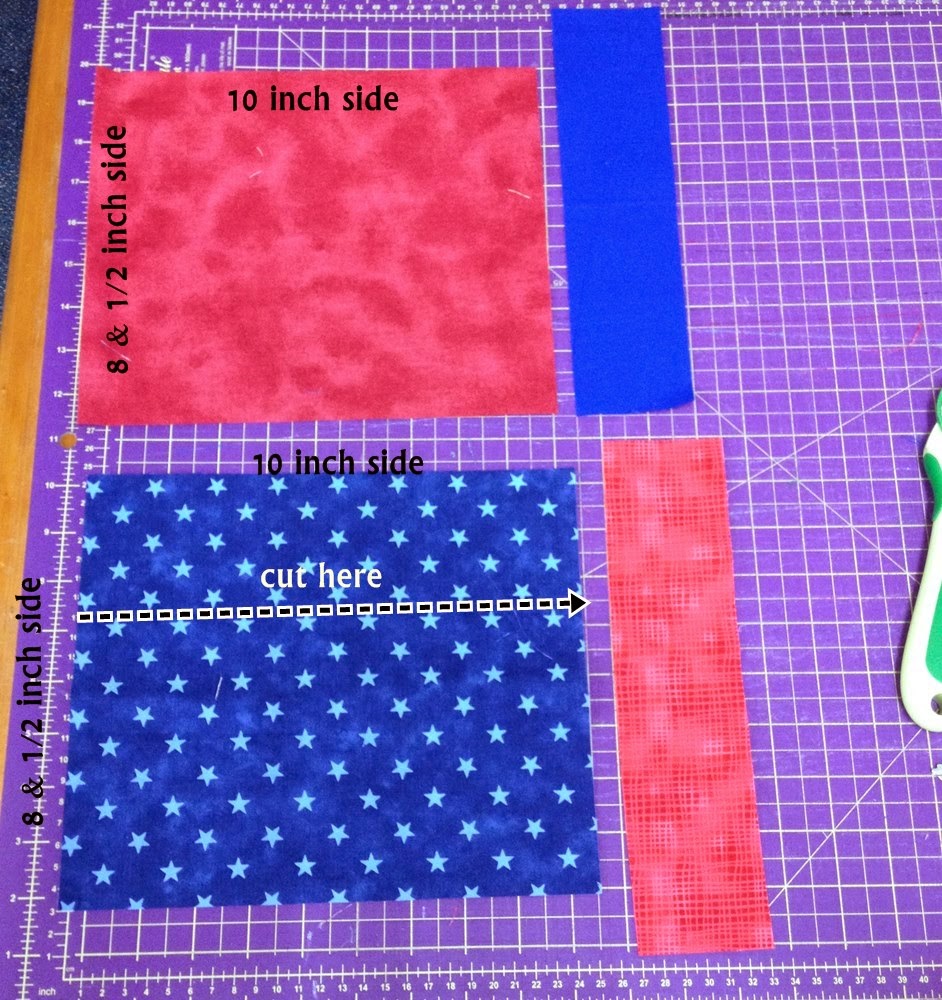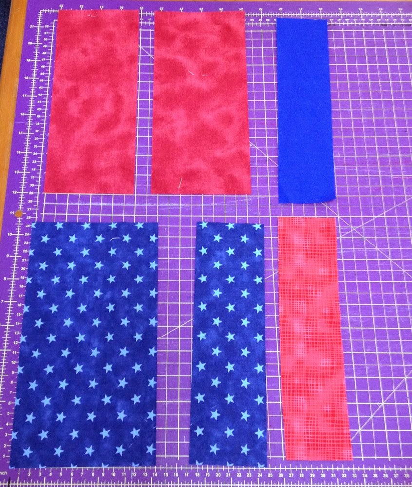 So firstly you will need a rectangle of 8 & 1/12 ” x 10 ” in one colour, and a rectangle of 2 & 1/2 ” x 10 ” in a second colour. For the purpose of this picture I have cut out 2 of each.