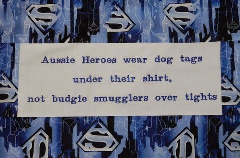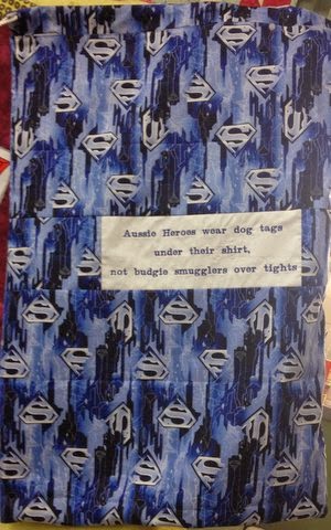 We had a very successful sewing day in Penrith yesterday.  Laundry bags were the project of the day Kiwi Karen, Carolyn and Caroline and I managed to get some cool ones done.  I have been dying to do this Superman one for ages and finally got the time to sew it up.  Thanks to Michele for embroidering my words for me – so much quicker than applique!