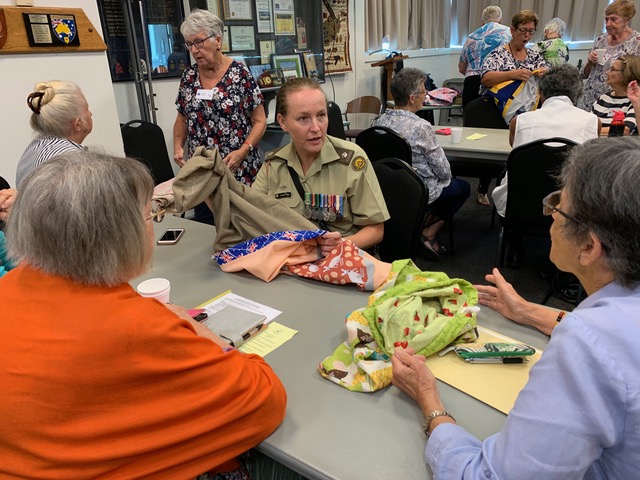 There was then a morning tea break, but most of these lovely ladies wanted more information and to see the examples of the quilts and LB’s. We had a “half-made” LB there, so they could see the simple and very effective design. There was also a handout slip that had all the contact information for AHQ, which they all eagerly took…..and lots of conversation and interaction as you can see in these photos