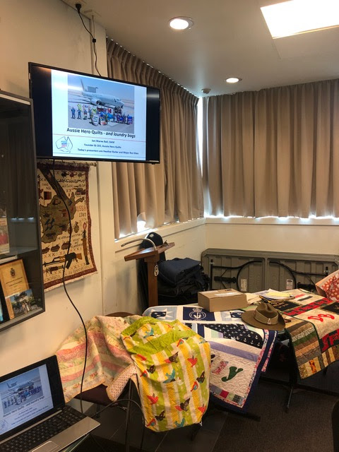 After a few Branch meeting formalities, it was our turn to take the floor. First up it was Heather’s turn to introduce the audience to “Aussie Heroes Quilts and Laundry Bags” – why and how it started almost 10 years ago and the impressive numbers we have achieved in that time.