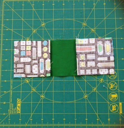 Stitch the three squares together in the second row in the same manner again pressing the seams towards the solid fabric.