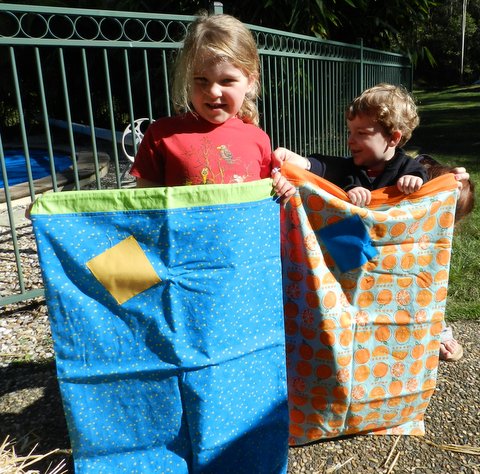 And Jan is a 7RAR mum, very glad to have her son home safe and sound.  Jan makes awesome laundry bags and brought some along as well.   You will see the rest of them on Wednesday night but here are two of them ably modeled by two of Angela’s littlest house guests.