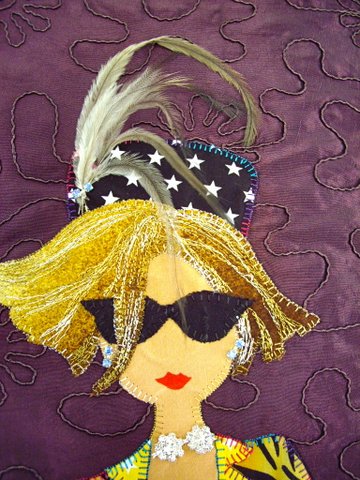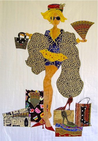 And now at last we come back to Molly’s quilt. Here it is in all it’s glory – no cigarette for this health conscious athletic girl. Just a glamorous fan and a gorgeous purse to hold the credit card for more shopping!