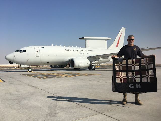 I hope you like the picture of our E7A Wedgetail aircraft and our myself with the quilt. We are located in Australia’s main operational base in the Middle East. The aircraft is a modified Boeing 737 and is used for Battlespace Management and has advanced Intelligence gathering, Surveillance and Reconnaissance Capabilities.