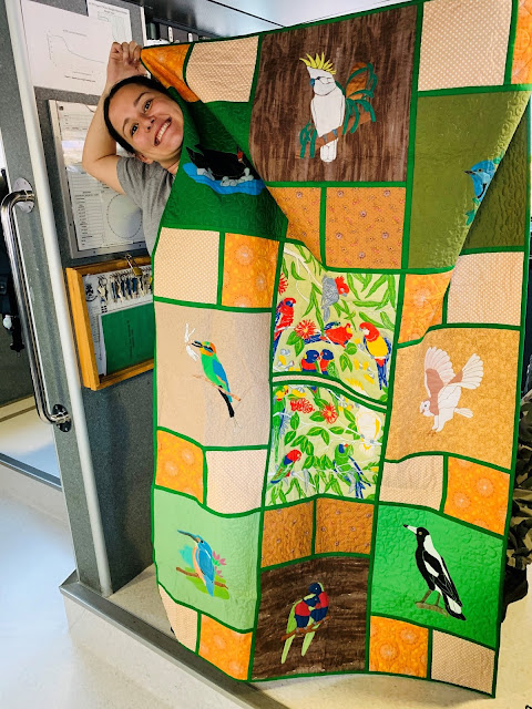 A special thanks to the quilting team including yourself, Jennifer W, Chris T and Kath M. I do however apologise for a typed letter and not handwritten, although I believe that my poor cursive may fail in comparison to your magnificent gift.