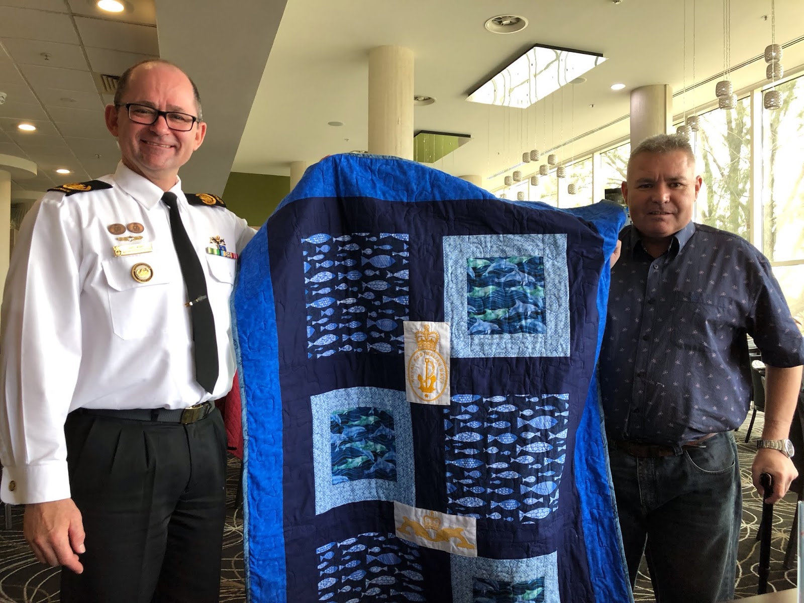 And just before we go. The Warrant Officer of the Navy, Warrant Officer Gary Wight, was pleased to present this quilt to Navy veteran, Bear, recently.