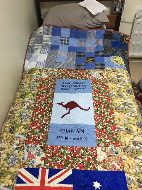 Thanks again for your fine efforts. I have shown the quilt off around the joint operations room within the headquarters and have piqued the interest of several colleagues who have since approached the Padre for a quilt of their own! You are doing a great job for the morale of soldiers, sailors and airmen/women here in theatre. Please keep up the excellent work – it is greatly appreciated.