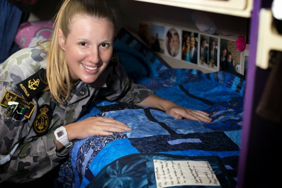 I received my quilt the other day from Coral W. Unfortunately there was no details included in the parcel for how I could pass on my thanks to her. Could you please pass my thanks to her. The quilt has made my small little space on my bed feel more like home. The detail in the quilt is superb. I particularly like the large ‘QUEENSLANDER’ across the top. It has cause a few friendly wars within the Wardroom. Once again thank you to Coral and all of your team for making these excellent tokens of support. They are boosting moral throughout the ship and making our time away from our loved ones seem not so bad.