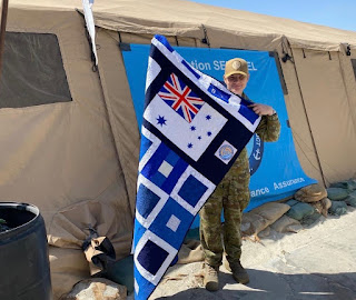 I understand the weather back home has been very cold this year. It has been extremely hot here. I cannot recall a day in the last month where the maximum temperature got below 40. And it is only going to get hotter before I leave. But I appreciate the opportunity to serve my country and the support we all get from home just makes things so much easier. Thank you again for your time and effort you put into making this beautiful quilt for me and support you provide to the Australian Defence Force. It is very much appreciated.