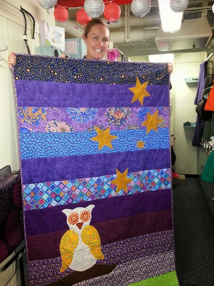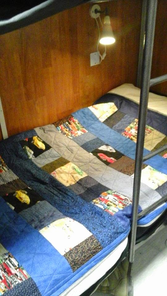 I know from my own personal stand point, and the opinions of my friends and colleagues onboard, that you and everyone else who takes time out to sew these quilts for us is much appreciated. I have laid mine out on my rack so everyone can check it out.