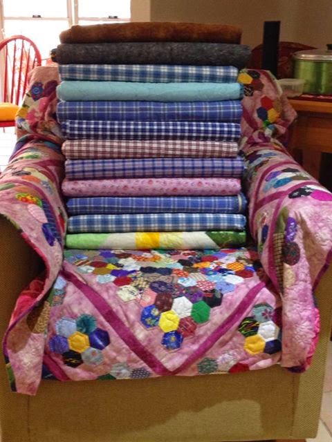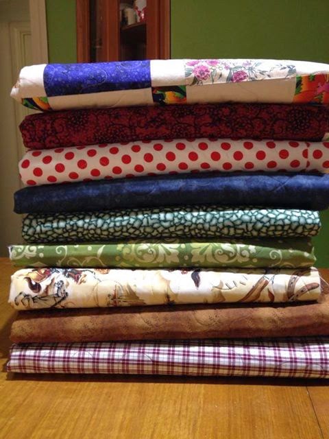 Evelyn and Robin also delivered ten quilts they had quilted and bound for me. This is what I worked on – packing quilts while they sewed!