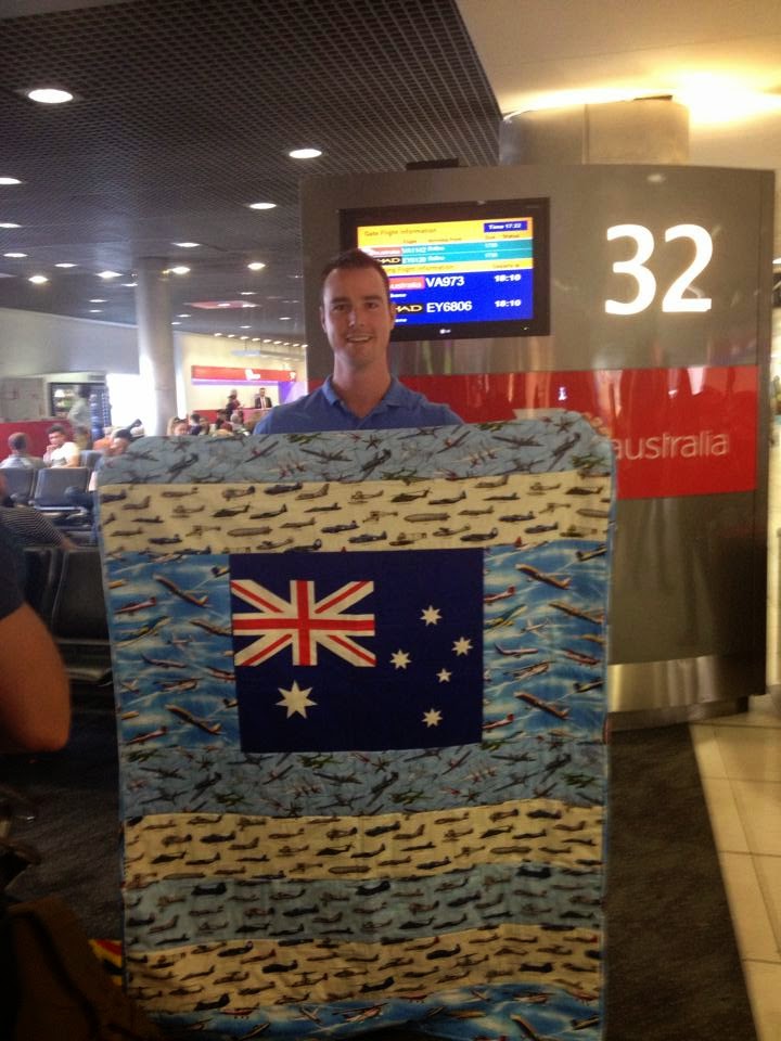 I can’t say thank you enough, the quilt made by Tamsin arrived today. 🙂 What perfect timing too, the weather has started to get a bit colder at night so will be great having it on my bed each night 🙂 What a wonderful surprise, it is amazing and gives my great pleasure and pride of Australia and Australians. Can you please pass on my sincere thanks and gratitude also the little extras in the box, they will be specially enjoyed by all of the guys and girls on deployment with me.