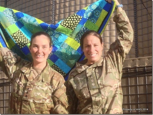 It was very unexpected but a wonderful surprise. I love the blue and green quilt; it will definitely get used out here to brighten up my room! My room mate is quite envious 🙂 It is nice to know that people back home are thinking about us – when the Government tells the public that we have pulled out of this war, it is easy to forget about the last few still here…
