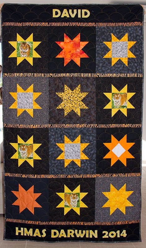 Just wanted to take the opportunity to let you know that I have received the quilt and laundry bag you have made in the mail and it is truly amazing! When I opened the parcel I saw the beautiful fabric with space and all the systems and the amount of joy that it brought me is immeasurable. God bless you all for such a wonderful gift. You have provided me with not only physical warmth but spiritual as well by knowing that there are people out in the community that actually care for Australian Defence Force personnel and think about the conditions that we are sometimes forced to endure. Again, thank you for the lovely card that you sent as well, it was fantastic to hear about your five sons, they must be remarkable young men with the worlds best mother! Funnily enough, reading about the cool weather you mentioned brought a smile to my face, I grew up in Melbourne on the outskirts of town and I am really missing cold weather like you would not believe. Everyone thinks that I am a touch crazy because I love cold weather but heat just does not do it for me in the slightest.